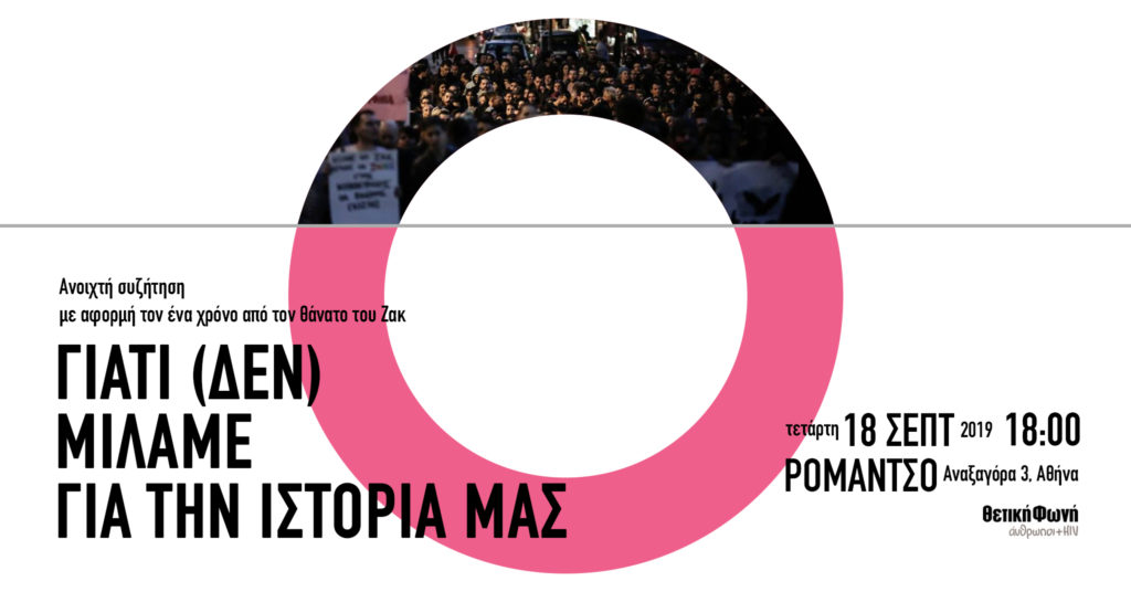 Με αφορμή τον ένα χρόνο από το θάνατο του Ζακ Κωστόπουλου, ο Σύλλογος Οροθετικών Ελλάδας «Θετική Φωνή» διοργανώνει μία ανοιχτή συζήτηση (open mic), εμπνευσμένη από τη δημόσια παρουσία και παρρησία του. Η εκδήλωση πραγματοποιείται την Τετάρτη 18 Σεπτεμβρίου 2019 στις 18:00 στο Ρομάντσο (Αναξαγόρα 3, Αθήνα), σε συνεργασία με το πρόγραμμα «HIV in Greece: A political archive».