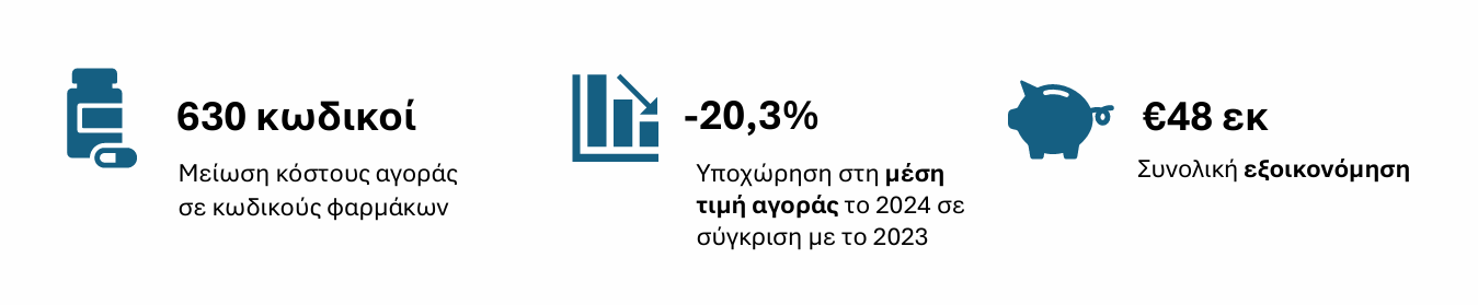 Το 2023, τα φάρμακα μόνιμης και έκτακτης κάλυψης με μηδενικό απόθεμα ανέρχονταν σε 63, ενώ το 2024 αυτός ο αριθμός μειώθηκε μόλις σε 11, εξασφαλίζοντας τη σταθερότητα της αγοράς και αποφεύγοντας τις έκτακτες εισαγωγές με υψηλότερο κόστος.