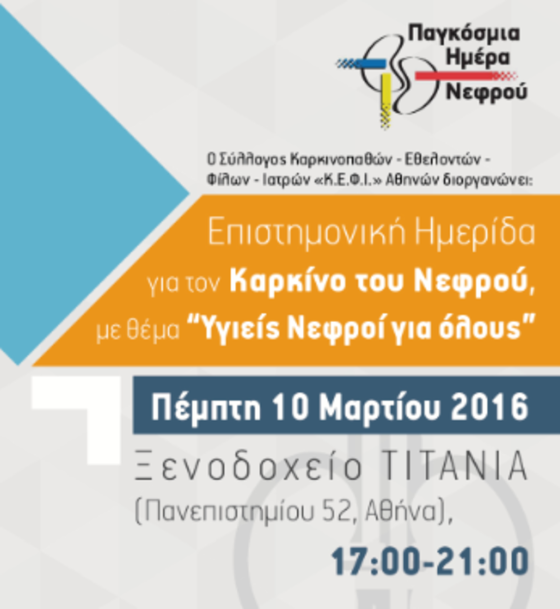 Η Επιστημονική Ημερίδα θα ξεκινήσει με την κα Ζωή Γραμματόγλου, Πρόεδρο Δ.Σ. Συλλόγου «Κ.Ε.Φ.Ι.» Αθηνών, η οποία θα απευθύνει χαιρετισμό και την σκυτάλη θα λάβει ο κ. Αναστάσιος Θάνος, Συντονιστής Διευθυντής Ουρολογικής Κλινικής , Νοσοκομείο «ο Άγιος Σάββας», Χειρουργός Ουρολόγος MD, Phd, FEBU, ο οποίος θα κάνει αναφορά στον Καρκίνο του Νεφρού και τους κυριότερους παράγοντες που σχετίζονται με αυξημένο κίνδυνο για εμφάνιση νεφροκυτταρικού καρκινώματος. Θα ακολουθήσει η ομιλία του κ. Θεόδωρου Λούτα, RN, Msc, Ναυτικό Νοσοκομείο Αθηνών, ο οποίος θα αναφερθεί στη νοσηλευτική προσέγγιση του ασθενούς με Καρκίνο του Νεφρού και η Ημερίδα θα ολοκληρωθεί με την ομιλία του κ. Ιωάννη Αυγουστάτου, Ψυχιάτρου – Ψυχοθεραπευτή, ο οποίος θα αναπτύξει το θέμα για την ψυχολογική υποστήριξη των ασθενών & των συγγενών στη διάρκεια της μακρόχρονης νοσηλείας και παρακολούθησης.