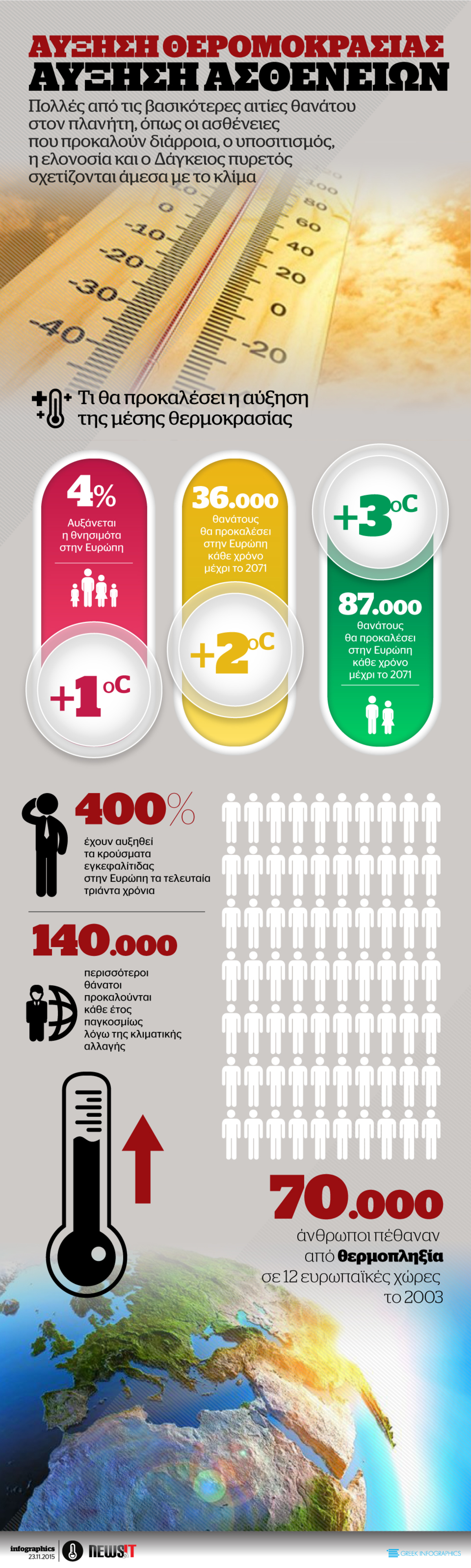 Και αν νομίζετε ότι απαιτείται κάποια μεγάλη αύξηση στην θερμοκρασία για να μας πλήξουν περισσότερες και πιο σοβαρές ασθένειες, κάνετε λάθος. Αρκούν μόλις 1-3 βαθμοί Κελσίου μεγαλύτερη μέση θερμοκρασία, για να έχουμε εκατοντάδες χιλιάδες περισσότερους θανάτους σε όλο τον κόσμο.