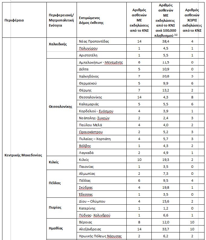 Στον Πίνακα 3 φαίνεται η γεωγραφική κατανομή των δηλωθέντων κρουσμάτων με εργαστηριακά διαγνωσμένη λοίμωξη από τον ιό του ΔΝ, ανά εκτιμώμενο Δήμο έκθεσης. Σημειώνεται ότι ο εκτιμώμενος τόπος έκθεσης των ανθρωπίνων κρουσμάτων από τον ιό του ΔΝ αποτελεί αδρό κριτήριο για την εκτίμηση των περιοχών κυκλοφορίας του ιού.