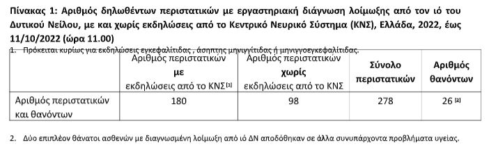 Αναλυτικά και σύμφωνα πάντα με τη νέα επιδημιολογική έκθεση του ΕΟΔΥ, από την αρχή της περιόδου 2022, μέχρι τις 11/10/2022 (ώρα 11.00), έχουν διαγνωστεί συνολικά διακόσια εβδομήντα οκτώ (278) εγχώρια κρούσματα λοίμωξης από τον ιό του Δυτικού Νείλου στην Ελλάδα, εκ των οποίων τα εκατόν ογδόντα (180) παρουσίασαν εκδηλώσεις από το Κεντρικό Νευρικό Σύστημα (ΚΝΣ, εγκεφαλίτιδα ή/και μηνιγγίτιδα ή/και οξεία χαλαρή παράλυση) και ενενήντα οκτώ (98) είχαν ήπιες εκδηλώσεις (π.χ. εμπύρετο νόσημα)/ δεν είχε εκδηλώσεις από το ΚΝΣ (Πίνακας 1).