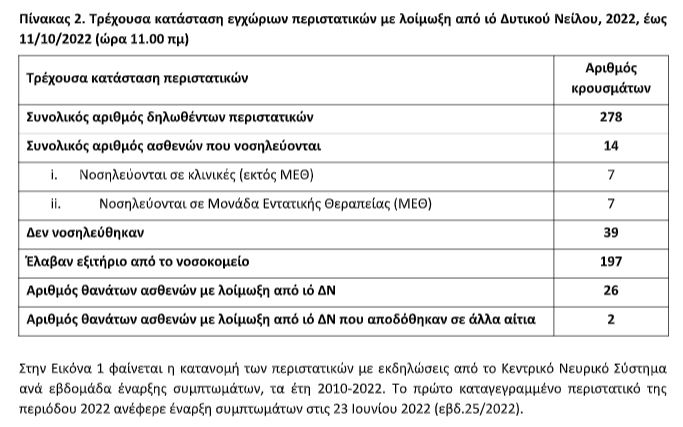 Δύο επιπλέον θάνατοι ασθενών με διαγνωσμένη λοίμωξη από τον ιό του Δυτικού Νείλου αποδόθηκαν σε άλλα σοβαρά συνυπάρχοντα προβλήματα υγείας (δεν συμπεριλαμβάνονται στον συνολικό αριθμό θανόντων).