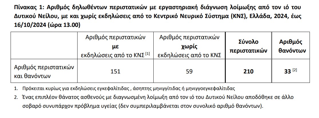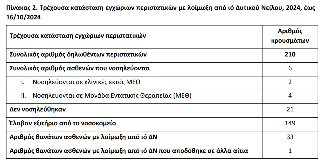 Σύμφωνα με τον ΕΟΔΥ, από την αρχή της περιόδου 2024, μέχρι τις 16/10/2024 (ώρα 13.00), έχουν διαγνωστεί και διερευνηθεί συνολικά διακόσια δέκα (210) εγχώρια κρούσματα λοίμωξης από τον ιό του Δυτικού Νείλου στην Ελλάδα, εκ των οποίων τα εκατόν πενήντα ένα (151) κρούσματα παρουσίασαν εκδηλώσεις από το Κεντρικό Νευρικό Σύστημα (ΚΝΣ, εγκεφαλίτιδα ή/και μηνιγγίτιδα ή/και οξεία χαλαρή παράλυση) και πενήντα εννέα (59) κρούσματα είχαν ήπιες εκδηλώσεις/ δεν είχαν εκδηλώσεις από το ΚΝΣ.