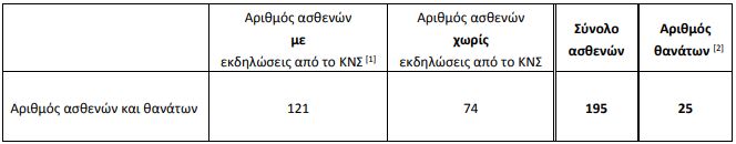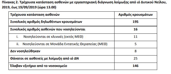 Από την αρχή της επιδημιολογικής επιτήρησης των κρουσμάτων λοίμωξης από τον ιό του Δυτικού Νείλου, 195 άνθρωποι έχουν προσβληθεί από τον ιό του Δυτικού Νείλου, ενώ οι 121 από αυτούς εμφάνισαν και εκδηλώσεις από το Κεντρικό Νευρικό Σύστημα. Από αυτούς σήμερα παραμένουν για νοσηλεία 16 άνθρωποι, σύμφωνα, με τον ΕΟΔΥ.