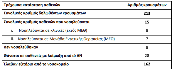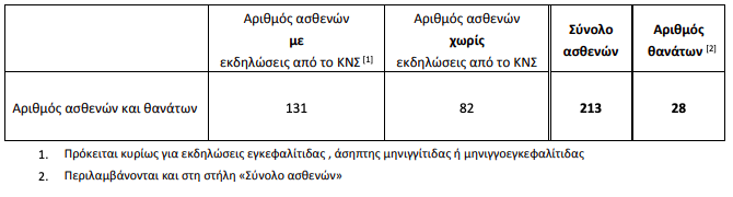 Από αυτά, τα 131 παρουσίασαν εκδηλώσεις από το Κεντρικό Νευρικό Σύστημα (ΚΝΣ, εγκεφαλίτιδα ή/και μηνιγγίτιδα ή/και οξεία χαλαρή παράλυση) και τα 82 είχαν ήπιες εκδηλώσεις (εμπύρετο νόσημα)/ δεν είχαν εκδηλώσεις από το ΚΝΣ