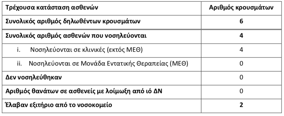 Και οι 6 ασθενείς που προσβλήθηκαν από τον ιό του Δυτικού Νείλου χρειάστηκαν νοσηλεία σε νοσοκομείο. Οι 4 νοσηλεύονται ακόμη, ενώ 2 έχουν πάρει εξιτήριο.