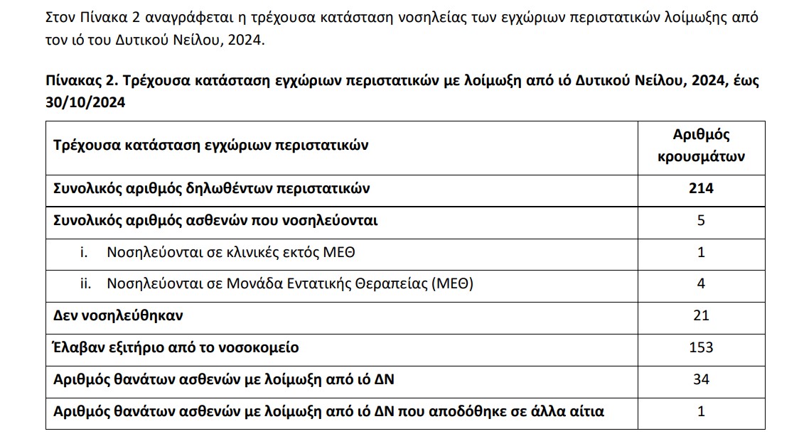 Σύμφωνα με την Εβδομαδιαία έκθεση επιδημιολογικής επιτήρησης της λοίμωξης από τον ιό του Δυτικού Νείλου σε ανθρώπους που έδωσε στη δημοσιότητα ο ΕΟΔΥ, από την αρχή της περιόδου 2024, μέχρι τις 30/10/2024 (ώρα 13.00), έχουν διαγνωστεί και διερευνηθεί συνολικά διακόσια δεκατέσσερα (214) εγχώρια κρούσματα λοίμωξης από τον ιό του Δυτικού Νείλου στην Ελλάδα, εκ των οποίων τα εκατόν πενήντα πέντε (155) κρούσματα παρουσίασαν εκδηλώσεις από το Κεντρικό Νευρικό Σύστημα (ΚΝΣ, εγκεφαλίτιδα ή/και μηνιγγίτιδα ή/και οξεία χαλαρή παράλυση) και πενήντα εννέα (59) κρούσματα είχαν ήπιες εκδηλώσεις/ δεν είχαν εκδηλώσεις από το ΚΝΣ.