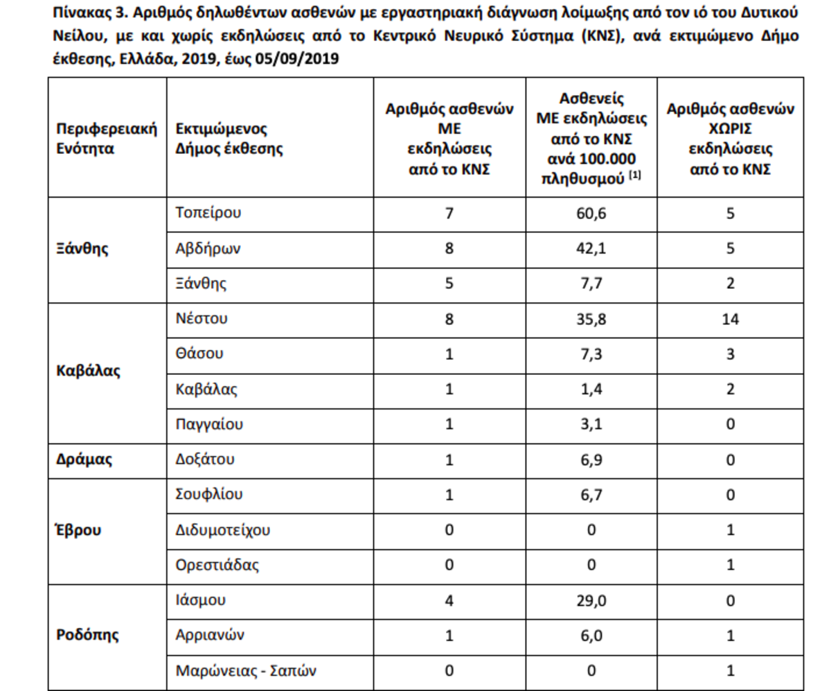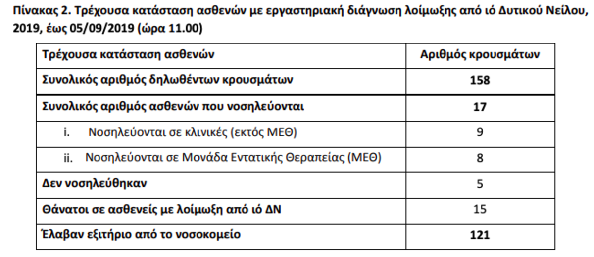 Από την αρχή της περιόδου καταγραφής των κρουσμάτων του Ιού του Δυτικού Νείλου το 2019 και μέχρι τις 05/09/2019, σύμφωνα με τις αρμόδιες υγειονομικές αρχές του Εθνικού Οργανισμού Δημόσιας Υγείας (ΕΟΔΥ), έχουν σημειωθεί 15 θάνατοι κι έχουν διαγνωστεί και διερευνηθεί 158 κρούσματα λοίμωξης από τον ιό του Δυτικού Νείλου στην Ελλάδα, εκ των οποίων τα 97 παρουσίασαν εκδηλώσεις από το Κεντρικό Νευρικό Σύστημα (ΚΝΣ, εγκεφαλίτιδα ή/και μηνιγγίτιδα ή/και οξεία χαλαρή παράλυση) και τα 61 είχαν μόνο ήπιες εκδηλώσεις (εμπύρετο νόσημα)