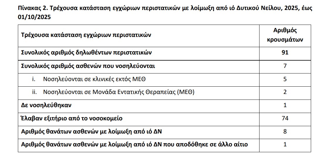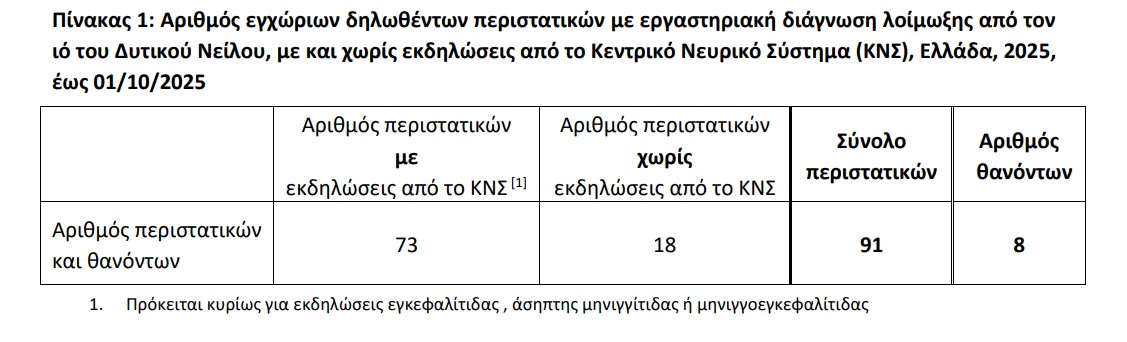 Σύμφωνα με την τελευταία ενημέρωση από τον ΕΟΔΥ, από την αρχή της περιόδου 2025, μέχρι τις 01/10/2025 (έως τις 13.00), έχουν διαγνωστεί και διερευνηθεί συνολικά 91 εγχώρια κρούσματα λοίμωξης από τον ιό του Δυτικού Νείλου στην Ελλάδα, εκ των οποίων τα εβδομήντα τρία (73) κρούσματα παρουσίασαν εκδηλώσεις από το Κεντρικό Νευρικό Σύστημα (ΚΝΣ, εγκεφαλίτιδα ή/και μηνιγγίτιδα ή/και οξεία χαλαρή παράλυση) και δεκαοκτώ (18) κρούσματα είχαν ήπιες εκδηλώσεις/ δεν είχαν εκδηλώσεις από το ΚΝΣ.
