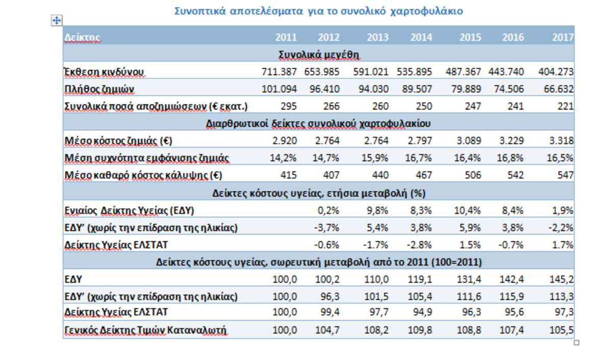 Άνοδος παρατηρείται στη συχνότητα εμφάνισης ζημιάς στο σύνολο της ελληνικής ασφαλιστικής αγοράς αυτών των προγραμμάτων την περίοδο 2011-2014, ενώ το μέσο κόστος ζημιάς ενισχύθηκε από το 2014. Ως αποτέλεσμα, το καθαρό κόστος κάλυψης αυξήθηκε κατά 31,8% το διάστημα 2011 – 2017, ενώ ο Ενιαίος Δείκτης Υγείας (ΕΔΥ), ο οποίος λαμβάνει υπόψη και την ηλιακή σύνθεση του χαρτοφυλακίου μακροχρόνιων νοσοκομειακών καλύψεων στην ελληνική αγορά, παρουσιάζει άνοδο 45,2% την ίδια περίοδο.