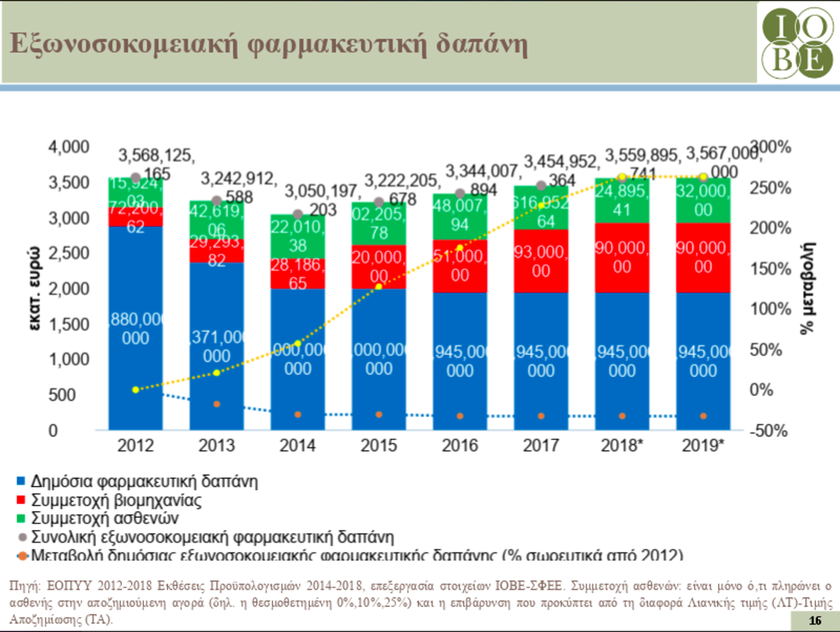 “Υπάρχει μεγαλύτερη πίεση πια στο δημόσιο σύστημα θέλετε και το μεταναστευτικό, θέλετε και λόγω της κρίσης που πια ολοένα και περισσότερος κόσμος απευθύνεται στα δημόσια νοσοκομεία, επομένως βλέπουμε πόσο έχει ανέβει η φαρμακευτική δαπάνη και πως η βιομηχανία συμμετέχει σ’αυτήν. Το 2019 εκτιμάται ότι η συμμετοχή της φαρμακοβιομηχανίας θα είναι περίπου στα €436 εκατ”, είπε ο Διευθυντής του ΙΟΒΕ κ.Νίκος Βέττας.