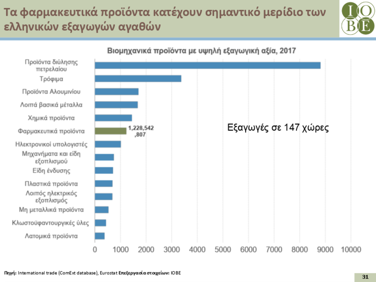 Σημαντικός είναι, όπως είπαν οι ομιλητές, και ο ρόλος του φαρμακευτικού κλάδου στο συνολικό εξωτερικό εμπόριο, καθώς οι εξαγωγές φαρμακευτικών προϊόντων ανήλθαν το 2018 σε €1,4 δισεκ. και αντιστοιχούν στο 4,3% του συνόλου των ελληνικών εξαγωγών όλων των αγαθών για το 2018.