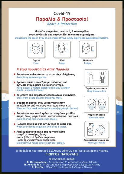 Η δράση που στοχεύει στην ενημέρωση των πολιτών για τα μέτρα προστασίας κατά του κορονοϊού στις παραλίες όλης της χώρας, θα γίνει σε 21 οργανωμένες και ελεύθερες παραλίες της Αττικής, στις οποίες θα διανεμηθούν 65.000 έντυπες οδηγίες και αντισηπτικά στους λουόμενους. Η δράση θα ολοκληρωθεί το επόμενο Σαββατοκύριακο 29 και 30 Μαΐου.