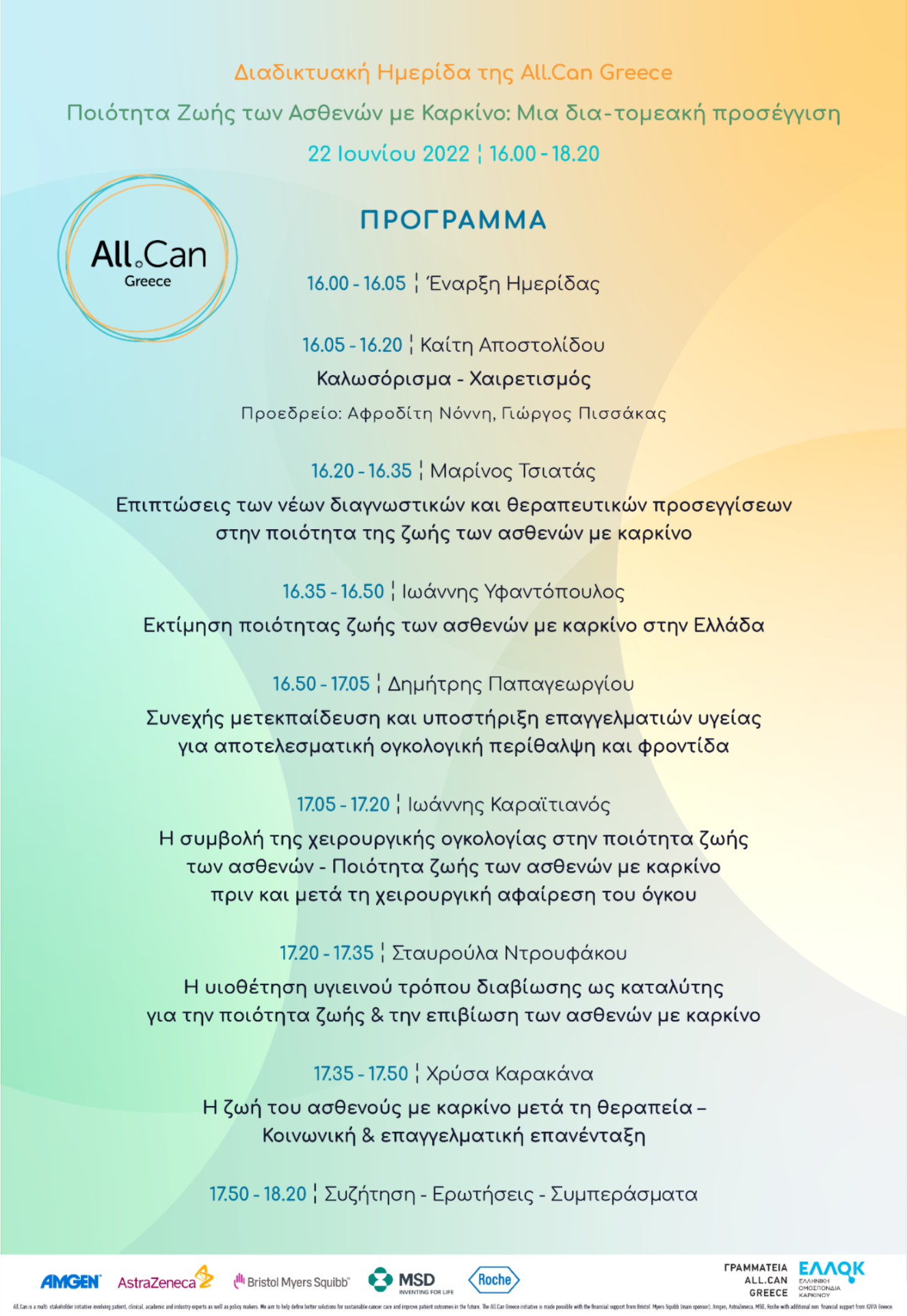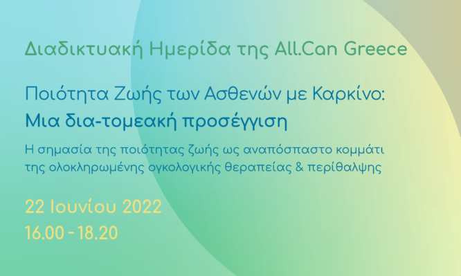 Διαδικτυακή επιστημονική ημερίδα με θέμα την ποιότητα ζωής των πασχόντων από καρκίνο πραγματοποιεί σήμερα Τετάρτη 22 Ιουνίου 2022 η πρωτοβουλία All.Can, μία ευρωπαϊκή διεπιστημονική πλατφόρμα που δημιουργήθηκε με σκοπό τη βελτίωση της αποτελεσματικότητας της ογκολογικής περίθαλψης και φροντίδα.