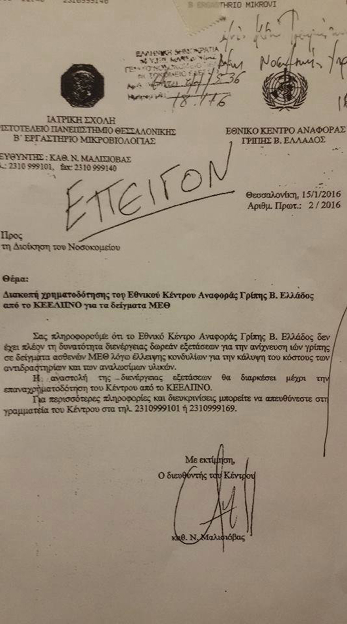 Ειδικότερα το Εθνικό Κέντρο Αναφοράς Γρίπης Βορείου Ελλάδος, ενημέρωσε ότι «δεν έχει πλέον τη δυνατότητα διενέργειας δωρεάν εξετάσεων, για την ανίχνευση ιών γρίπης, σε δείγματα ασθενών ΜΕΘ λόγω έλλειψης κονδυλίων, για την κάλυψη του κόστους των αντιδραστηρίων και των αναλώσιμων υλικών».