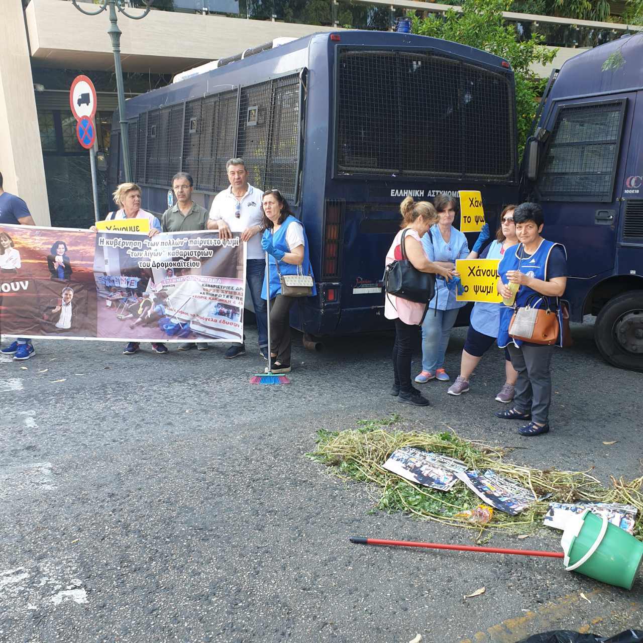 Φορώντας μπλε ποδιές και με τα εργαλεία της δουλειάς τους υπό μάλης, τους κουβάδες, τις σφουγγαρίστρες και τα σκουπόξυλα, οι εργολαβικές καθαρίστριες διεκδικούν τις δουλειές τους, καθώς – όπως λένε – η πολιτική ηγεσία του υπουργείου Υγείας συνεχώς τις εμπαίζει, με ψεύτικες διαβεβαιώσεις ότι θα ανανεωθούν οι συμβάσεις τους, χωρίς όμως, να έχουν γίνει κάποιες ενέργειες προς αυτή την κατεύθυνση.