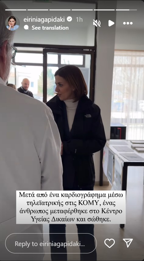 Συγκεκριμένα, όπως έκανε γνωστό με story της στο Instagram η αναπληρώτρια υπουργός Υγείας, Ειρήνη Αγαπηδάκη, μετά από καρδιογράφημα που έγινε μέσω τηλεϊατρικής στις ΚΟΜΥ, κάτοικος του Ορμενίου διαγνώστηκε με κολπική μαρμαρυγή και μεταφέρθηκε στο Κέντρο Υγείας Δικαίων για περαιτέρω αξιολόγηση και αντιμετώπιση.