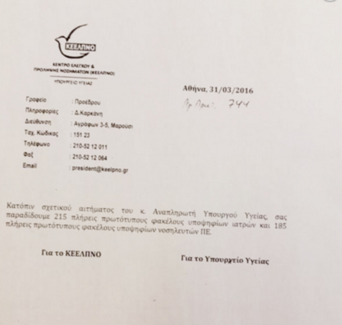 Στο έγγραφο, με ημερομηνία 31/3/2016, αναφέρεται χαρακτηριστικά ότι «κατόπιν σχετικού αιτήματος του κ. αναπληρωτή υπουργού Υγείας, σας παραδίδουμε 215 πλήρεις πρωτότυπους φακέλους υποψηφίων ιατρών και 185 πλήρεις πρωτότυπους φακέλους υποψηφίων νοσηλευτών ΠΕ».