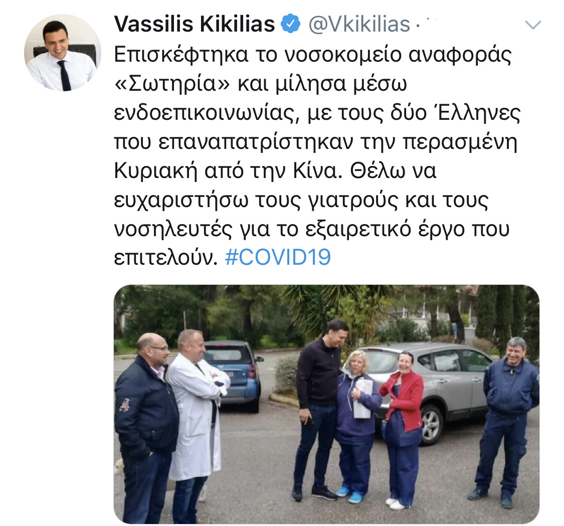 «Επισκέφτηκα το νοσοκομείο αναφοράς «Σωτηρία» και μίλησα μέσω ενδοεπικοινωνίας, με τους δύο Έλληνες που επαναπατρίστηκαν την περασμένη Κυριακή από την Κίνα. Θέλω να ευχαριστήσω τους γιατρούς και τους νοσηλευτές, για το εξαιρετικό έργο που επιτελούν», επεσήμανε ο κ. Κικίλιας
