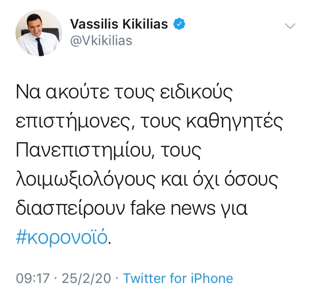 Ανάρτηση για το φλέγον θέμα δημόσιας υγείας των ημερών, την επιδημία που κοροναϊού που πρόφατα έπληξε και την Ιταλία, έκανε ο υπουργός Υγείας Βασίλης Κικίλιας.