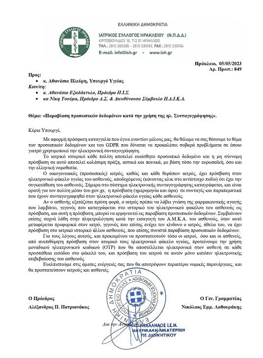 “Το ιατρικό ιστορικό κάθε πολίτη αποτελεί ευαίσθητο προσωπικό δεδομένο και η μη σύννομη πρόσβαση σε αυτό αποτελεί κολάσιμη πράξη, αστικά και ποινικά, με βάση τόσο την ευρωπαϊκή όσο και την ελληνική νομοθεσία”, τονίζουν συγκεκριμένα τα μέλη του Συλλόγου.