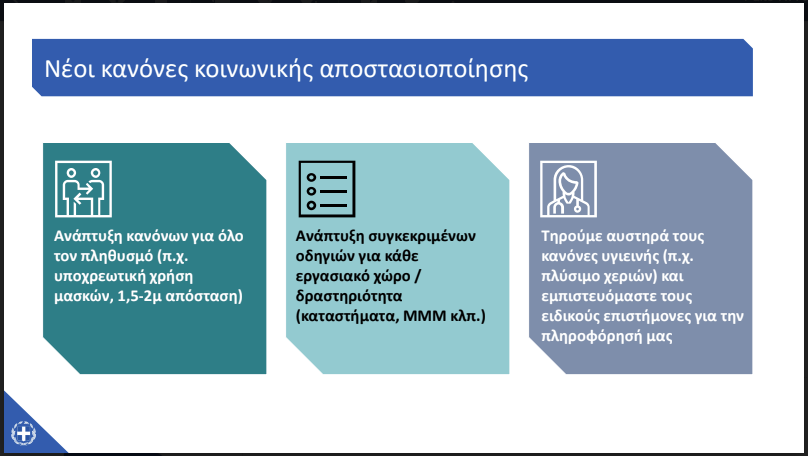 Αναφερόμενος στους κανόνες της επόμενης μέρας που θα μας βοηθήσουν να μείνουμε ασφαλείς και να μην επιστρέψουμε στα μέτρα περιορισμού, ο υφυπουργός Υγείας τόνισε ότι αυτά θα είναι οι νέες συνήθειες που αποκτήσαμε το προηγούμενο διάστημα.