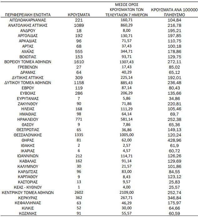 Από το σύνολο των 15.869 νέων κρουσμάτων του νέου ιού στη χώρα 5 είναι εισαγόμενα. Η κατανομή των νέων εγχώριων κρουσμάτων (18.991) ανά Περιφερειακή Ενότητα παρουσιάζεται στους κατωτέρω πίνακες: