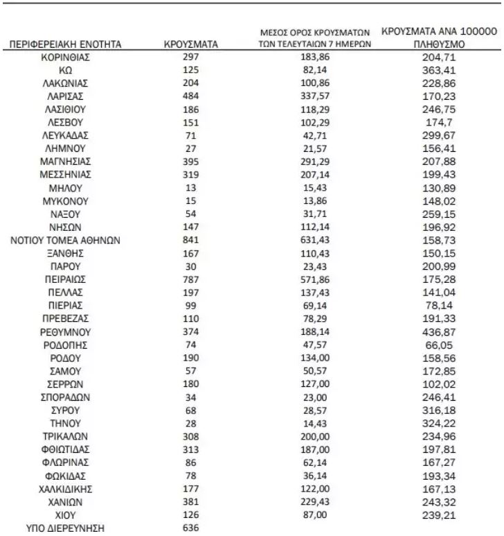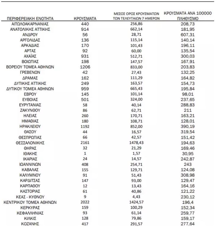 Το Ηράκλειο ακολουθεί με 1192 κρούσματα, ενώ η Αχαΐα έφτασε τα 931.