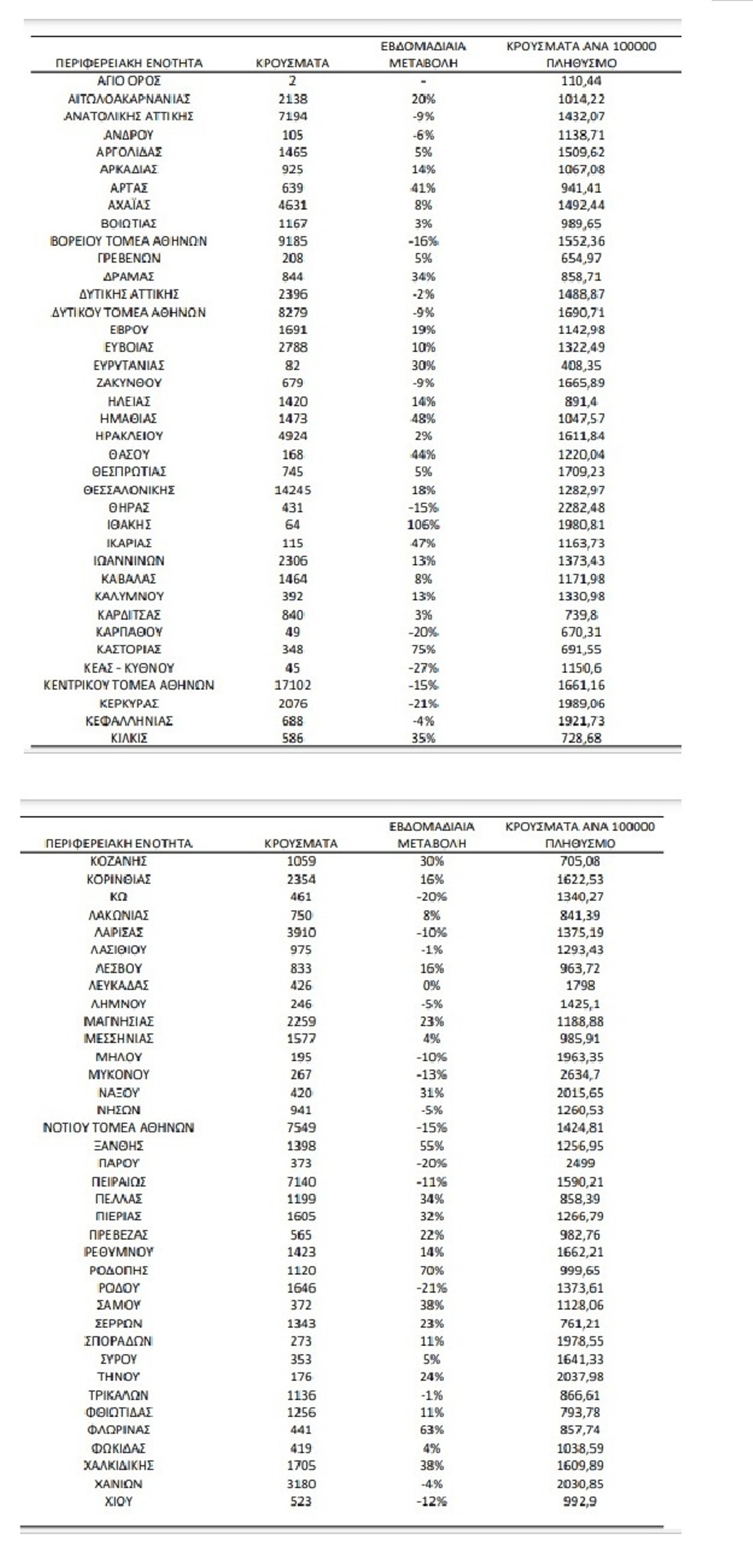 Στους πίνακες που ακολουθούν παρατίθεται το σύνολο των κρουσμάτων την εβδομάδα 11-17 Ιουλίου 2022 Η ανά Περιφερειακή Ενότητα της χώρας. Αναφέρεται επίσης η αναλογία ανά 100.000 πληθυσμού και η ποσοστιαία μεταβολή (αρνητική ή θετική) σε σύγκριση με την προηγούμενη εβδομάδα (4-10 Ιουλίου 2022):