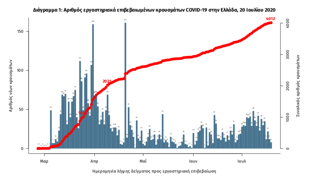 Με βάση τα νέα δεδομένα που έχουν δηλωθεί στον ΕΟΔΥ και καταγραφεί μέχρι τις 20 Ιουλίου 2020 (ώρα 15:00), τα νέα εργαστηριακά επιβεβαιωμένα κρούσματα της νόσου είναι 11, εκ των οποίων τα 2 εντοπίστηκαν κατόπιν ελέγχων στις πύλες εισόδου της χώρας.