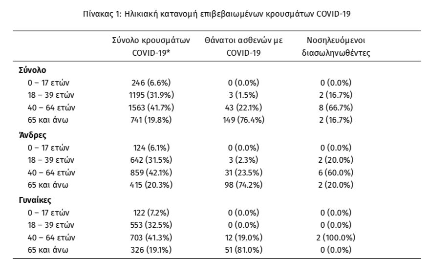 Η μέση ηλικία των κρουσμάτων είναι 47 έτη (εύρος 0 έως 102 ετών), ενώ η μέση ηλικία των θανάτων είναι 76 έτη (εύρος 35 έως 102 ετών). Η ηλικιακή κατανομή των (α) συνολικών κρουσμάτων, (β) των περιστατικών που κατέληξαν σε θάνατο και (γ) των ασθενών που νοσηλεύονται διασωληνωμένοι, είναι η ακόλουθη: