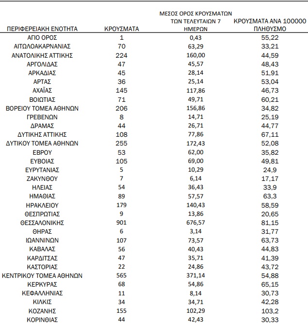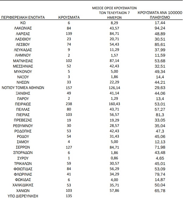 Με βάση τα επιβεβαιωμένα κρούσματα των τελευταίων 7 ημερών, 114 θεωρούνται σχετιζόμενα με ταξίδι από το εξωτερικό και 2.987 είναι σχετιζόμενα με ήδη γνωστό κρούσμα