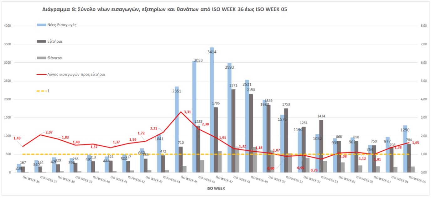 Στο παρακάτω διάγραμμα του ΕΟΔΥ, μπορείτε να δείτε τις νέες εισαγωγές και τα εξιτήρια στα νοσοκομεία, αλλά και τους θανάτους:
