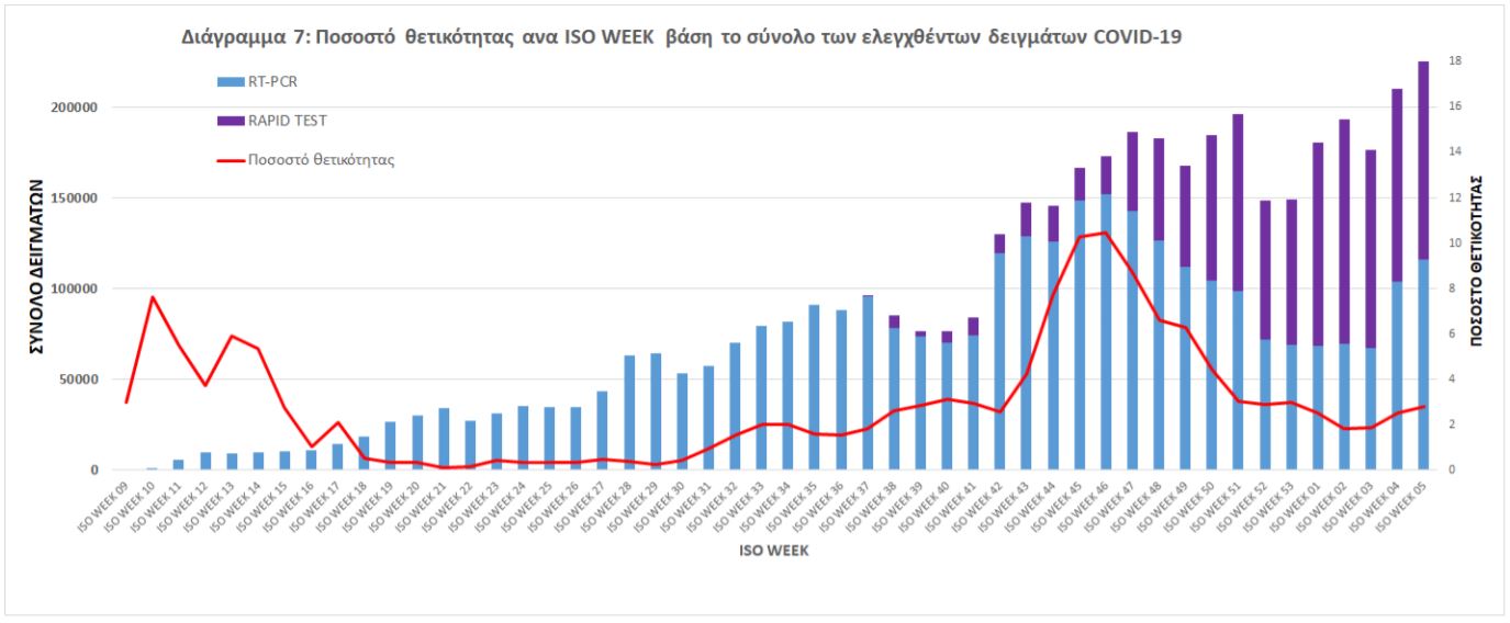 Σύμφωνα με νεότερη ενημέρωση από τον ΕΟΔΥ, την εβδομάδα μεταξύ 01 και 07 Φεβρουαρίου (Iso Week 05) το ποσοστό θετικότητας ήταν 2,81% σε σύνολο 115.994 μοριακά τεστ (PCR) και 136.783 Rapid Ag τεστ που πραγματοποιήθηκαν.