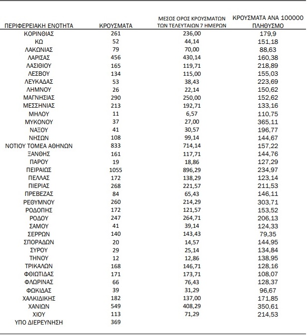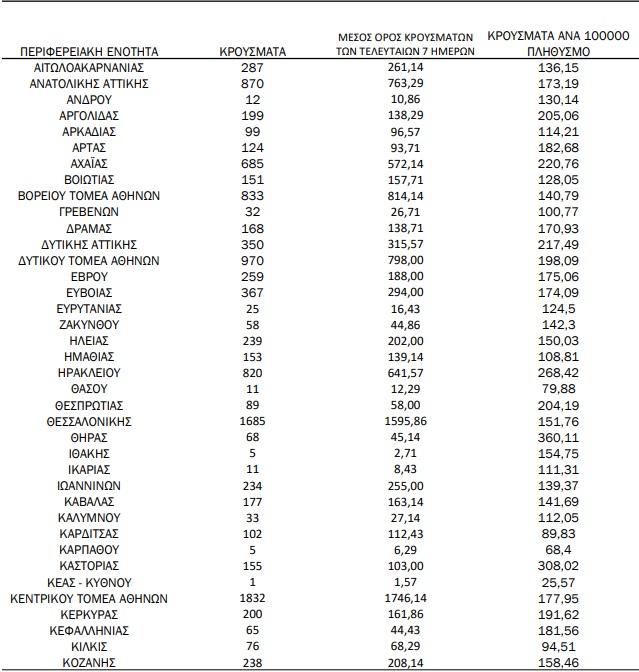 Οι περιφέρειες – πλην Αττικής – που καταγράφουν τριψήφιο αριθμό κρουσμάτων, είναι:
