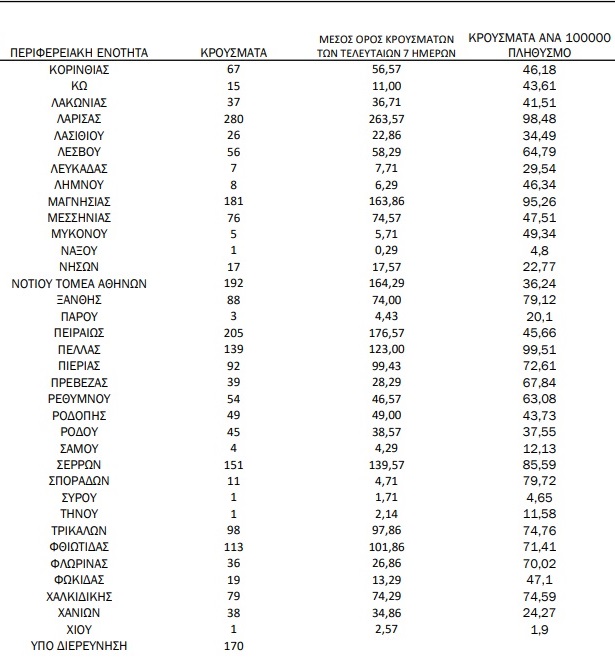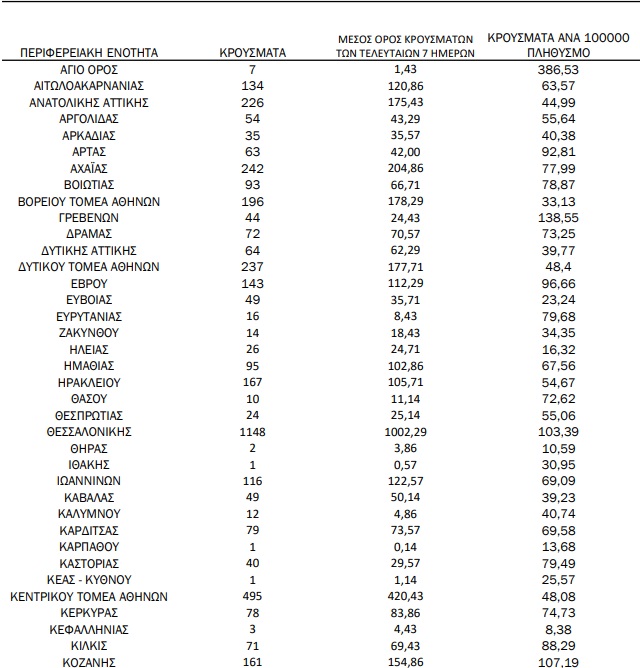 Με βάση τα επιβεβαιωμένα κρούσματα των τελευταίων 7 ημερών, 100 θεωρούνται σχετιζόμενα με ταξίδι από το εξωτερικό και 2.625 είναι σχετιζόμενα με ήδη γνωστό κρούσμα. To Rt για την επικράτεια βάσει των κρουσμάτων εκτιμάται σε 1,11.