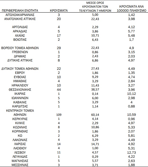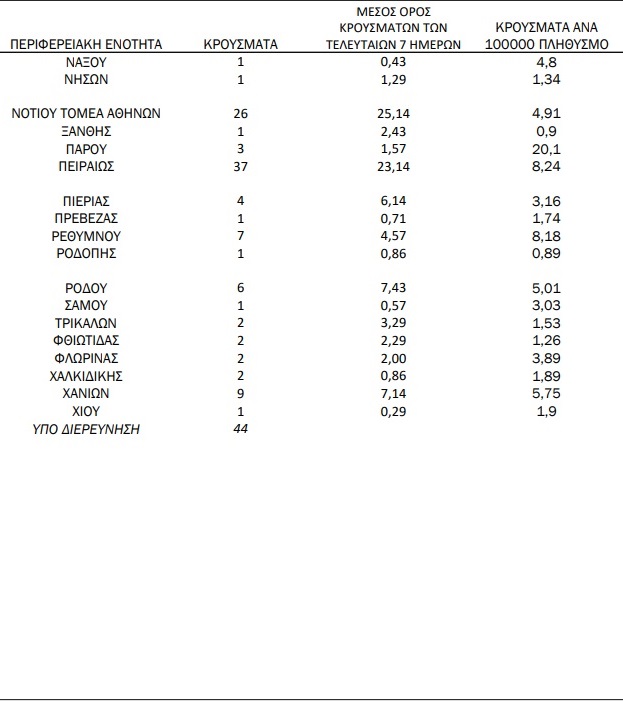 Με βάση τα επιβεβαιωμένα κρούσματα των τελευταίων 7 ημερών, 26 θεωρούνται σχετιζόμενα με ταξίδι από το εξωτερικό και 1.015 είναι σχετιζόμενα με ήδη γνωστό κρούσμα.