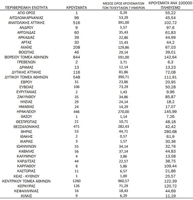 Από το σύνολο των 8.283 νέων κρουσμάτων του νέου ιού στη χώρα 6 είναι εισαγόμενα. Η κατανομή των νέων εγχώριων κρουσμάτων (8.277) ανά Περιφερειακή Ενότητα παρουσιάζεται στους κατωτέρω πίνακες:
