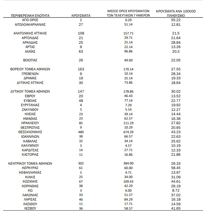 Αττική και Θεσσαλονίκη διατηρούν την πρωτιά με 954 και 480 κρούσματα αντίστοιχα.