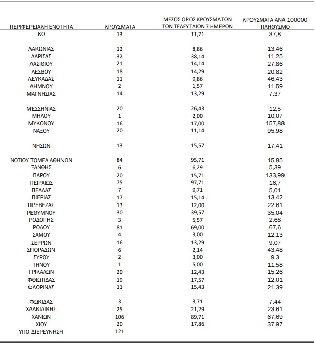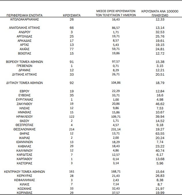 Με βάση τα επιβεβαιωμένα κρούσματα των τελευταίων 7 ημερών, 155 θεωρούνται σχετιζόμενα με ταξίδι από το εξωτερικό και 1.687 είναι σχετιζόμενα με ήδη γνωστό κρούσμα.