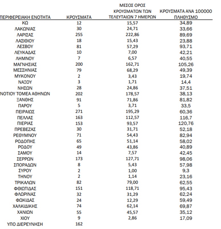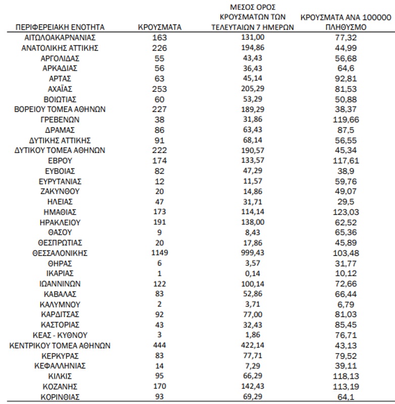 Στην κορυφή των κρουσμάτων παραμένει η Αττική με 1.711 και ακολουθεί κατά πόδας η Θεσσαλονίκη με 1.149 κρούσματα και η Θεσσαλία με 637 κρούσματα.