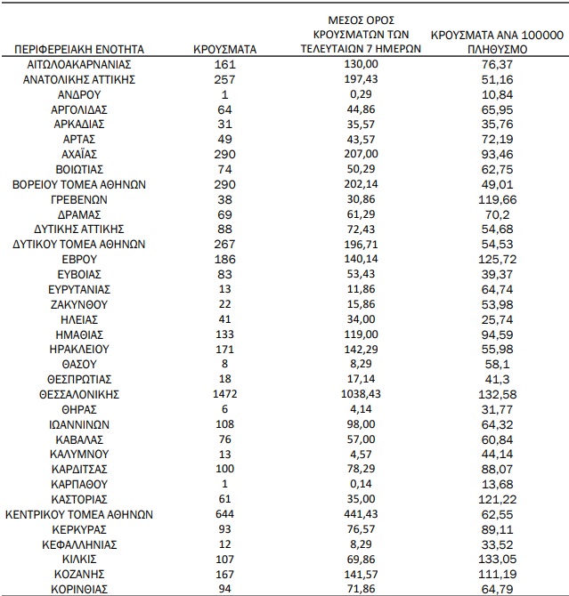 Με βάση τα επιβεβαιωμένα κρούσματα των τελευταίων 7 ημερών, 93 θεωρούνται σχετιζόμενα με ταξίδι από το εξωτερικό και 2.355 είναι σχετιζόμενα με ήδη γνωστό κρούσμα.