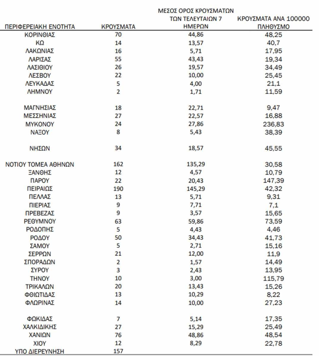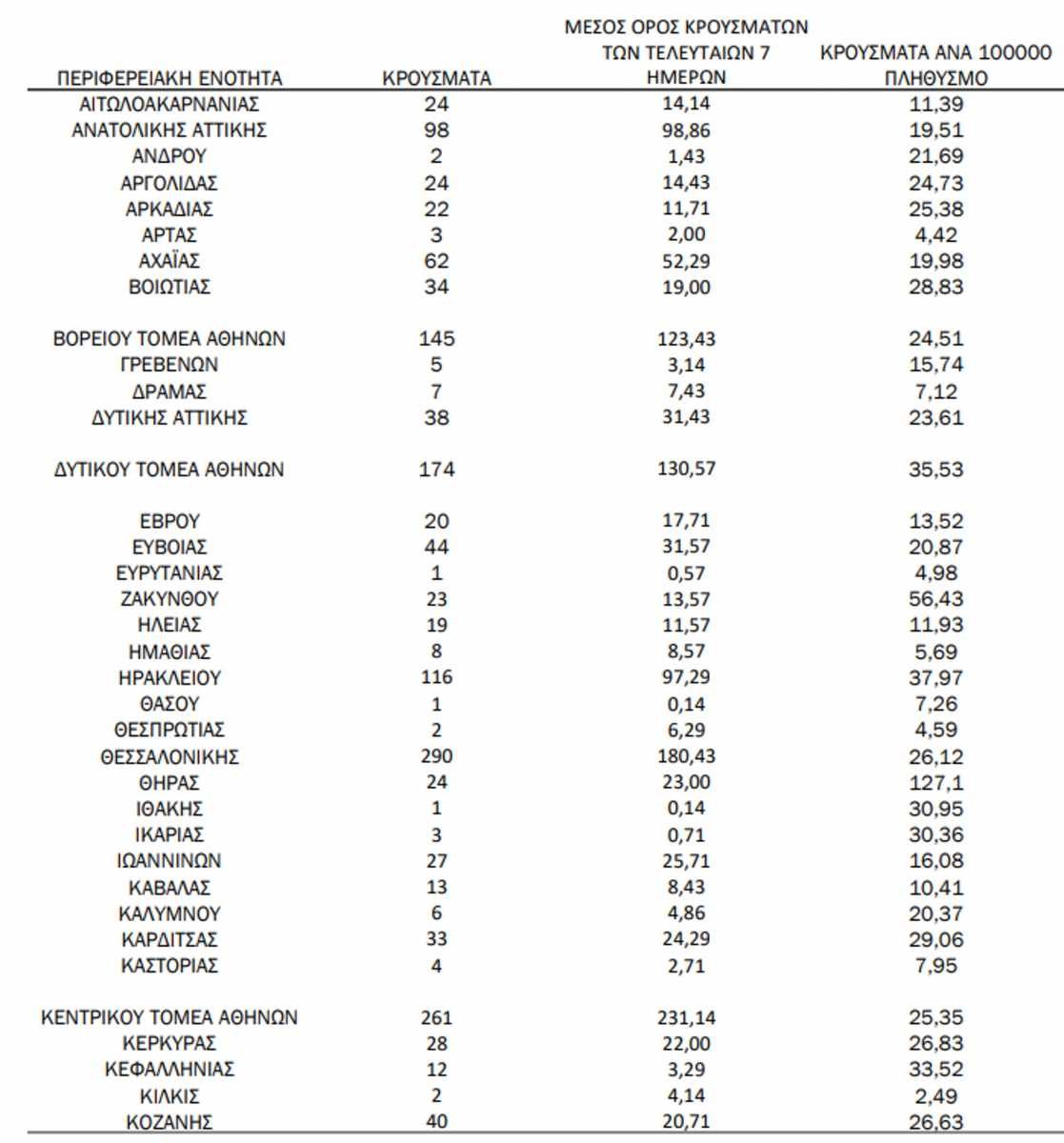 Πίνακες: Ημερήσιος αριθμός και κρούσματα ανά 100.000 πληθυσμού επιβεβαιωμένων εγχώριων κρουσμάτων COVID-19 ανά περιφερειακή