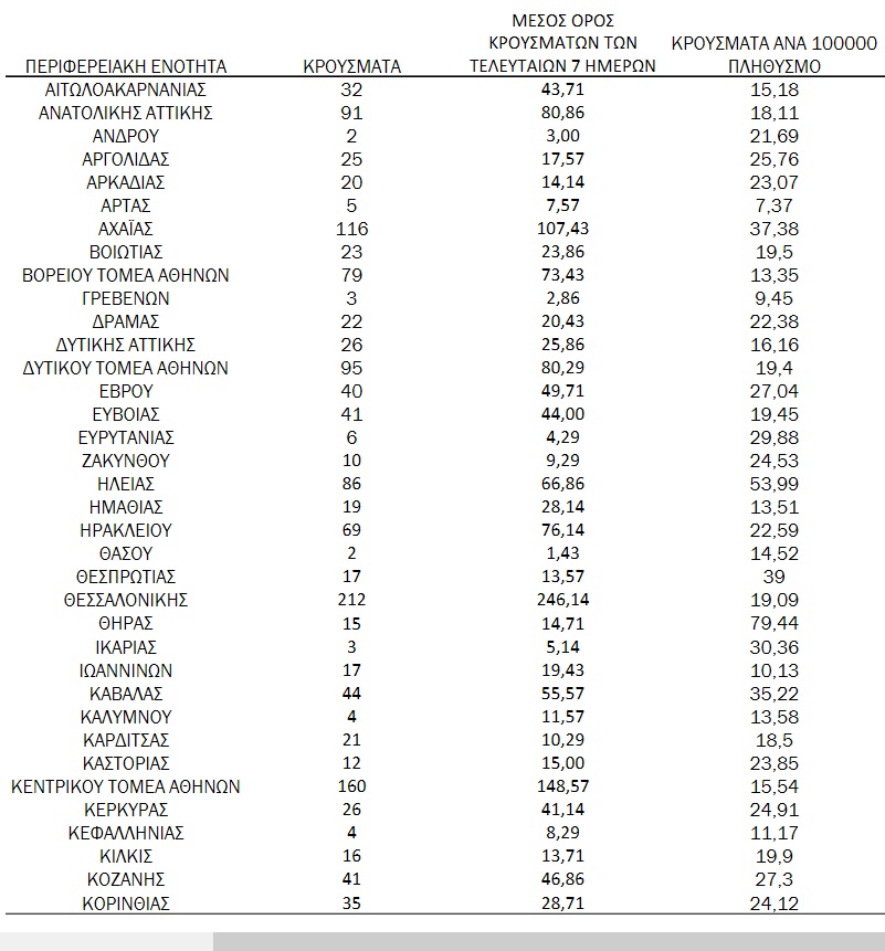 Από τα 2.343 νέα κρούσματα, σύμφωνα με τον ΕΟΔΥ, τα 614 καταγράφηκαν στην Αττική. Επίσης, τα 212 από τα νέα κρούσματα καταγράφηκαν στη Θεσσαλονίκη, τα 129 στην Κρήτη και τα 116 στην Αχαΐα.