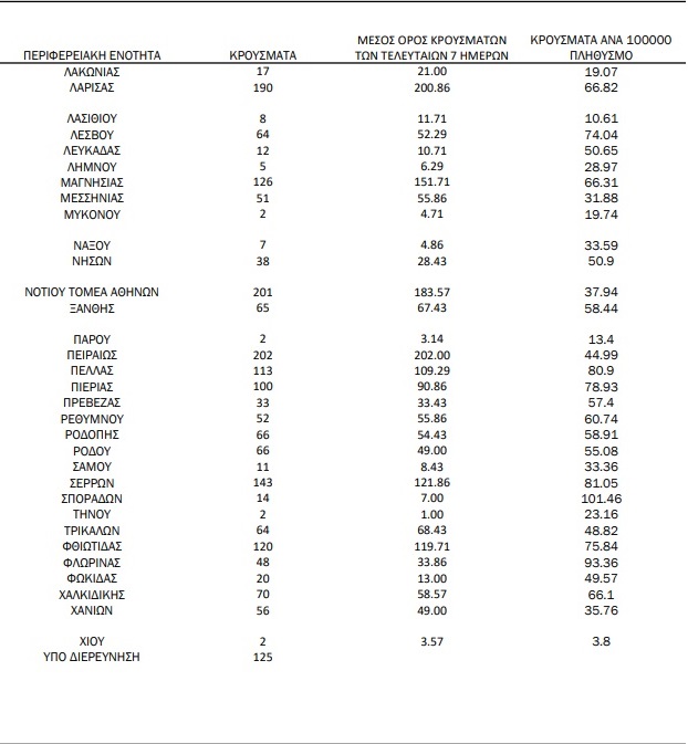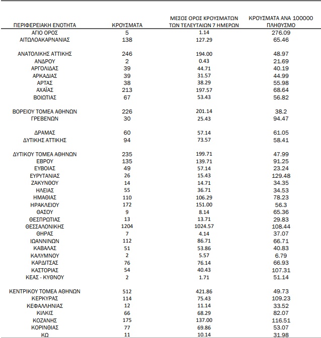 Από αυτά τα στοιχεία προκύπτει ότι εκ των συνολικά 6.602 νέων κρουσμάτων, τα 1.754 εντοπίστηκαν στην Αττική, 1.204 στη Θεσσαλονίκη και 470 στη Θεσσαλία.