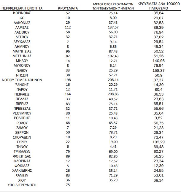 Από το σύνολο των 4.561 νέων κρουσμάτων του νέου ιού στη χώρα 9 είναι εισαγόμενα. Η κατανομή των νέων εγχώριων κρουσμάτων ανά Περιφερειακή Ενότητα παρουσιάζεται στους κατωτέρω πίνακες: