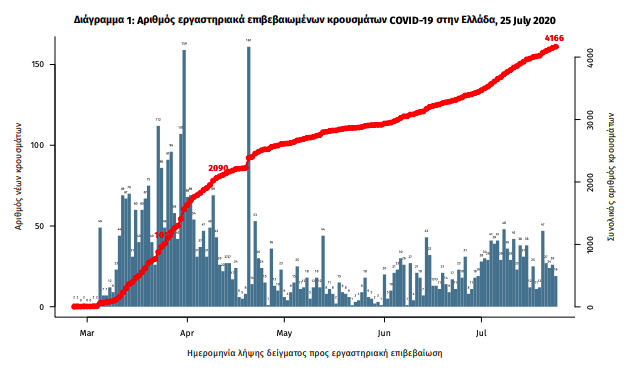 Την επιδημιολογική εικόνα της χώρας για τη νόσο COVID-19, όπως αποτυπώθηκε από τις υγειονομικές αρχές έως το Σάββατο 25/7/20, έδωσε στη δημοσιότητα και σήμερα ο Εθνικός Οργανισμός Υγείας (ΕΟΔΥ).
