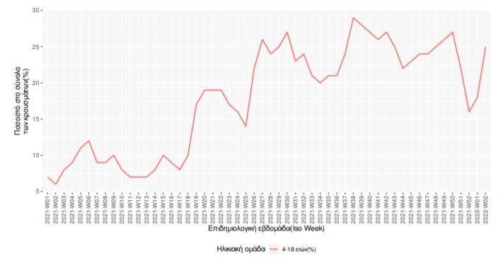 Διάγραμμα: Δείτε το ποσοστό των κρουσμάτων ατόμων ηλικίας 4-18 ετών στο σύνολο των κρουσμάτων COVID-19 ανά επιδημιολογική εβδομάδα αναφοράς: 2021-01-04 έως 2022-01-16