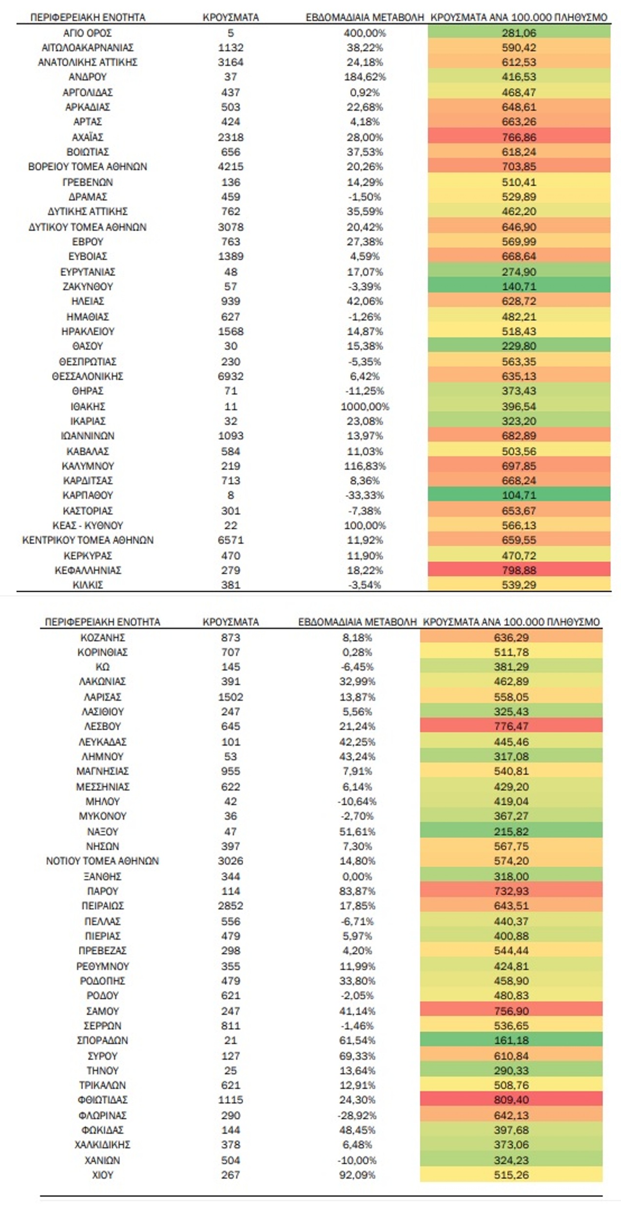 Στους πίνακες που ακολουθούν παρατίθεται το σύνολο των κρουσμάτων που προκάλεσε ο κορωνοϊός την εβδομάδα 31 Οκτωβρίου – 6 Νοεμβρίου 2022 ανά περιφερειακή ενότητα της χώρας. Αναφέρεται επίσης η αναλογία ανά 100.000 πληθυσμού και η ποσοστιαία μεταβολή (αρνητική ή θετική) σε σύγκριση με την προηγούμενη εβδομάδα (24-30 Οκτωβρίου 2022).